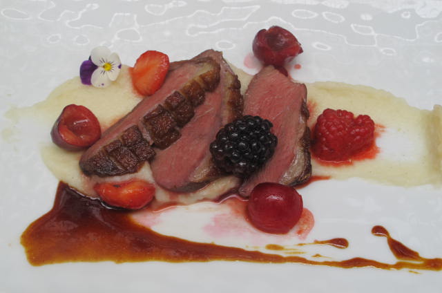 Magret de canard rôti aux fruits rouges Jus de canard et purée de céleri à la vanille