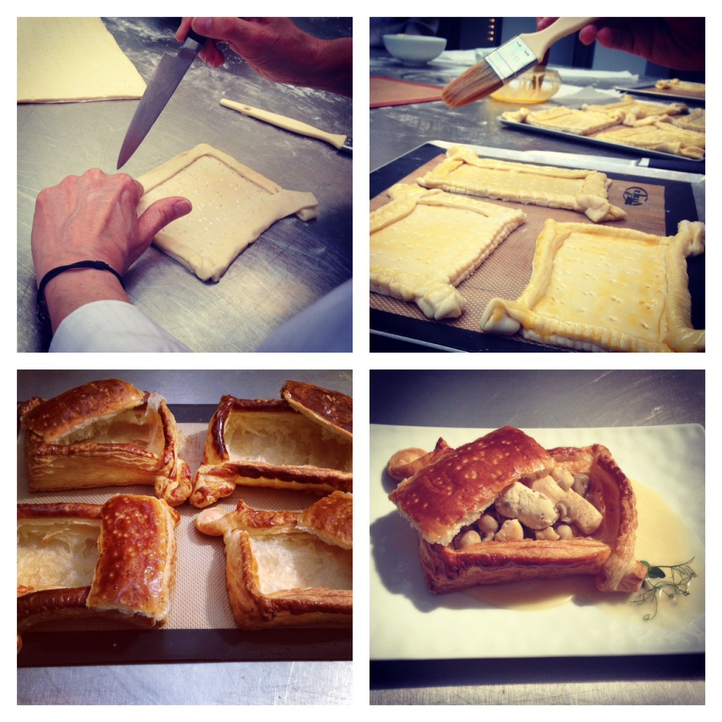 Dans une poêle, réchauffez les crêtes de coq, sot-l’y-laisse et champignons dans un peu de sauce poulette. Sur une assiette ronde, déposez les carrés de pâte feuilletée et garnissez-les de la garniture chaude. Faites un trait de sauce poulette et une pointe de sauce légère au siphon.